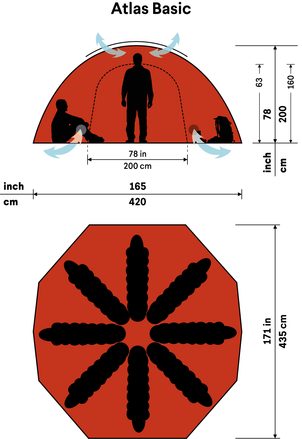 The Atlas can be used in its Basic form, with no inner tent or floor, or it can be customized as needed with a variety of options. The Inner Tent 8 and 6, which sleep eight and six persons, respectively, both have sewn-in floors. The Floorless Inner also sleeps eight, and can be paired with the Detachable Floor, which can also be used without the inner tent. External Vestibules can be added to either door, and the Connector can join multiple Atlas tents together. And the included Carrier Bag is designed to function as a backpack for transporting an Atlas and all its optional components in a compact, easy-to-carry package.